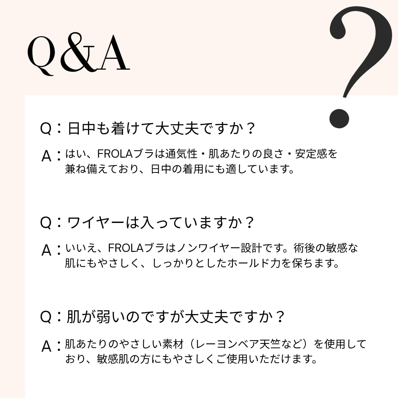 - 「術後の痛みが不安でしたが、FROLAブラを着けていると安心感がありました。肌あたりもとても優しく、長時間着けても快適でした。」